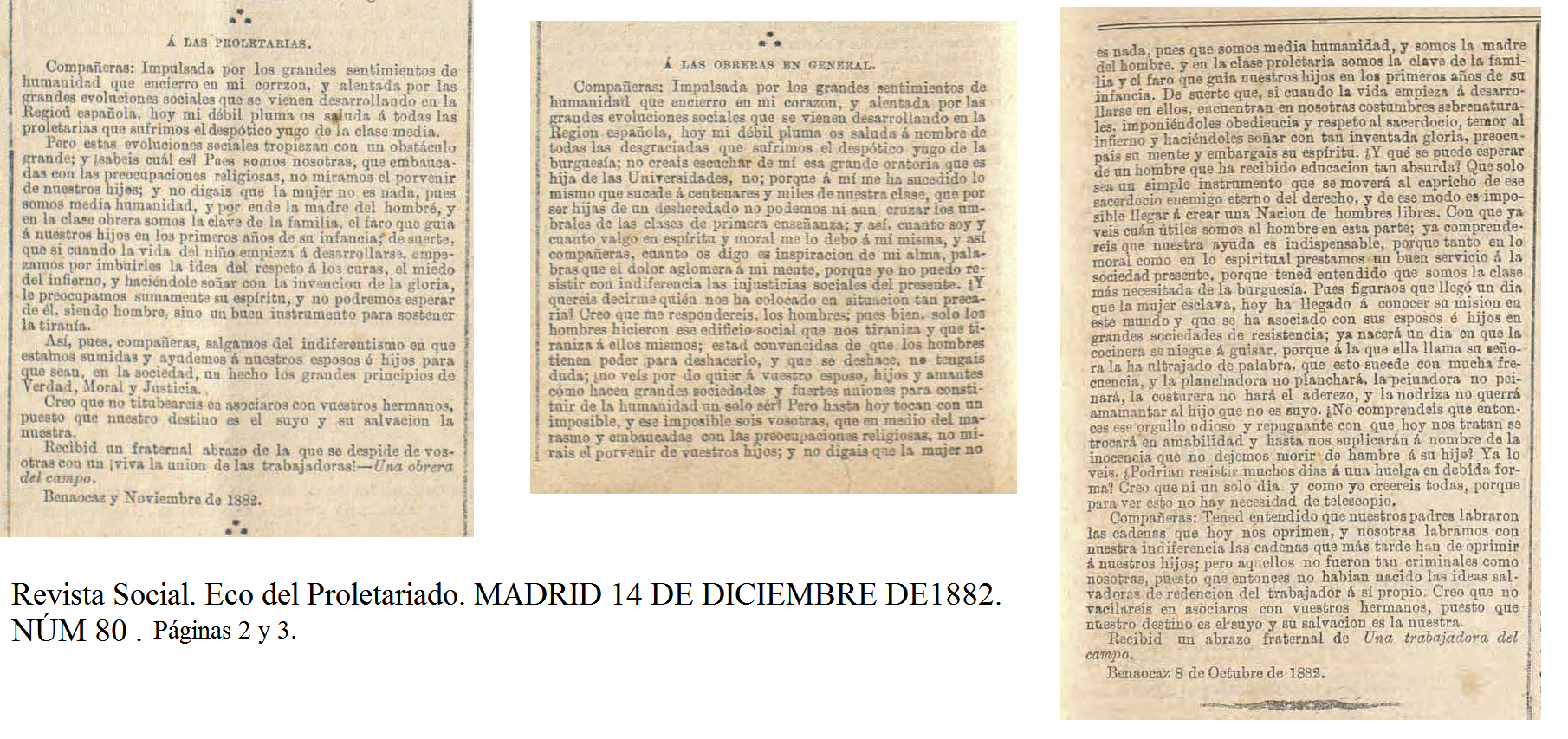 Compañeros de trabajo: A vosotros me dirijo para manifestaros que, compañeras de fatigas y trabajos como vosotros, deseamos invitéis a vuestras mujeres a que se asocien, pues es una parte de vuestro ser y le corresponden los mismos derechos que al hombre para defender sus intereses y para librarse de ese yugo que nos tiraniza y explota; que tanto nos hace sucumbir bajo la miseria que por todas partes nos rodea.