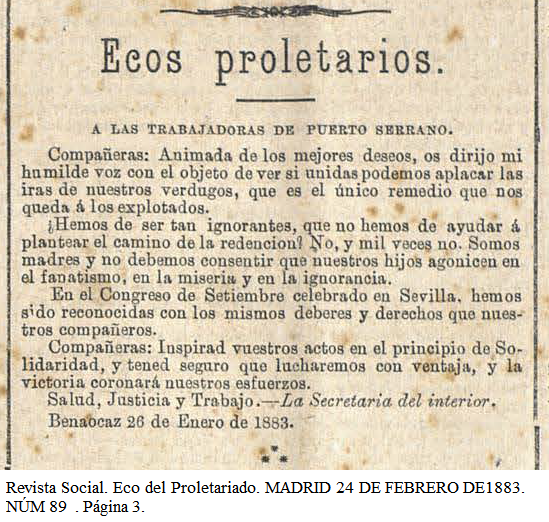 Compañeras: Es la primera vez que me dirijo a mis hermanas y espero que me escuchéis. ¿No veis que nos explotan cada vez más? ¿No veis que hoy no puede ninguna obrera levantar la cabeza sin que la burguesía no la sujete? ¿No es doloroso que esté una obrera todo un mes trabajando para ganar 14 rs., que no tiene ni para el aseo de su cuerpo? Si cae mala no tiene par alimentarse, y si es casad sus hijos la piden pan y no lo tiene. ¿Para qué más pena? Despertad de vuestro letargo, y para que nuestros padres trabajan por nosotras, trabajemos para nuestro hijos.