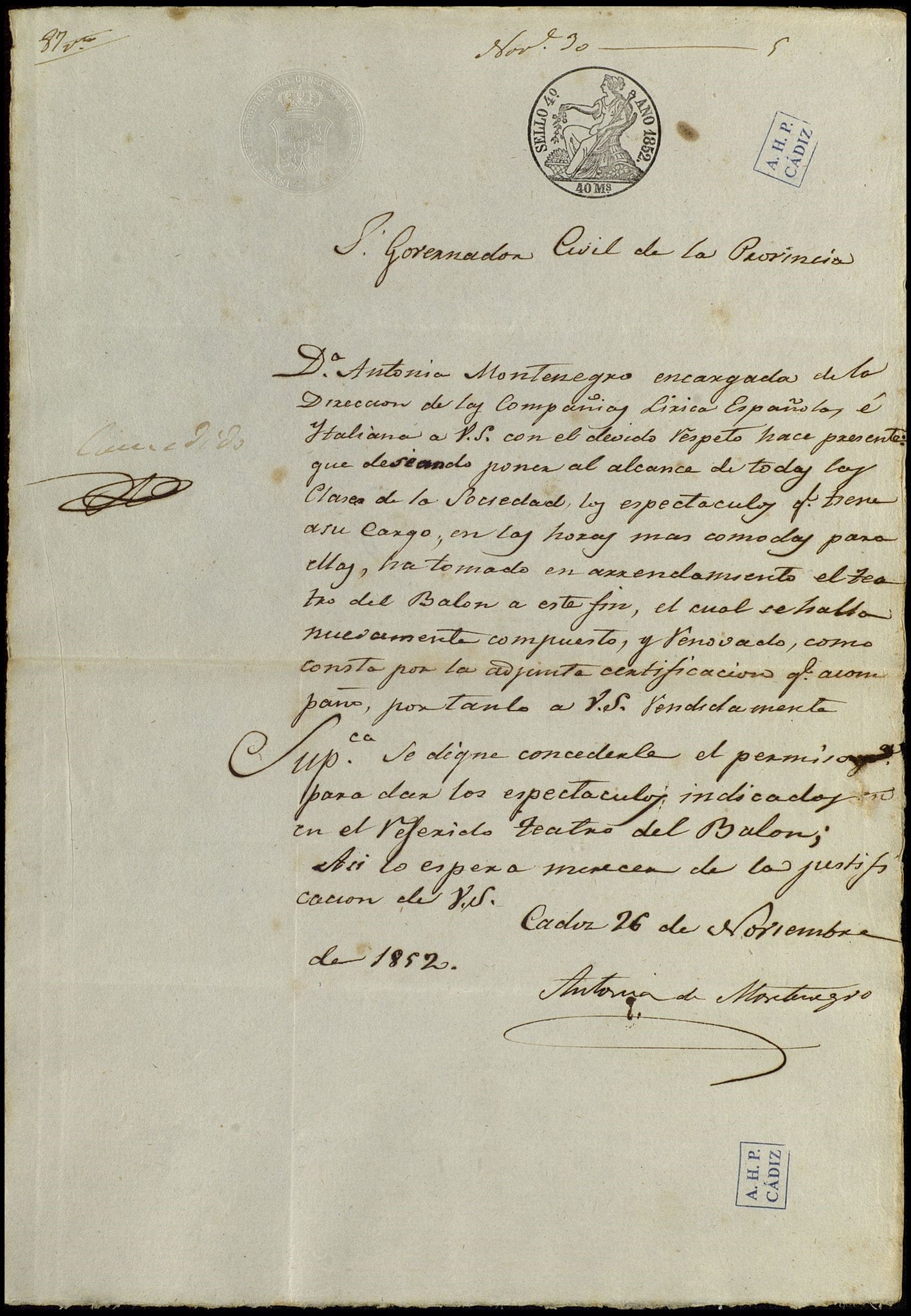 El 26 de Noviembre de 1852, María Antonia Montenegro, directora de la Compañía lírica española e italiana, solicita autorización al Gobernador Civil de la provincia para representar espectáculos en el Teatro del Balón.
